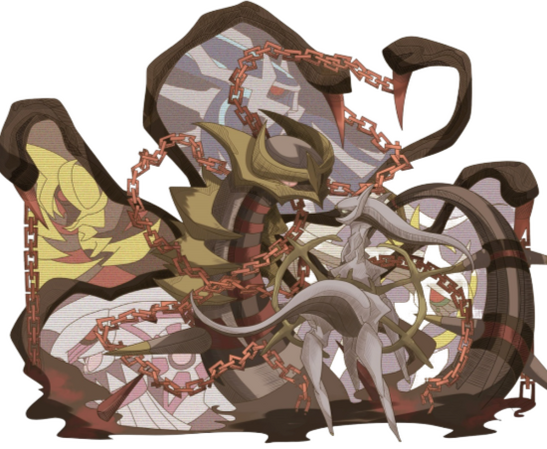 Hitch of a breath.Her eyes opened and Giratina gazed out.